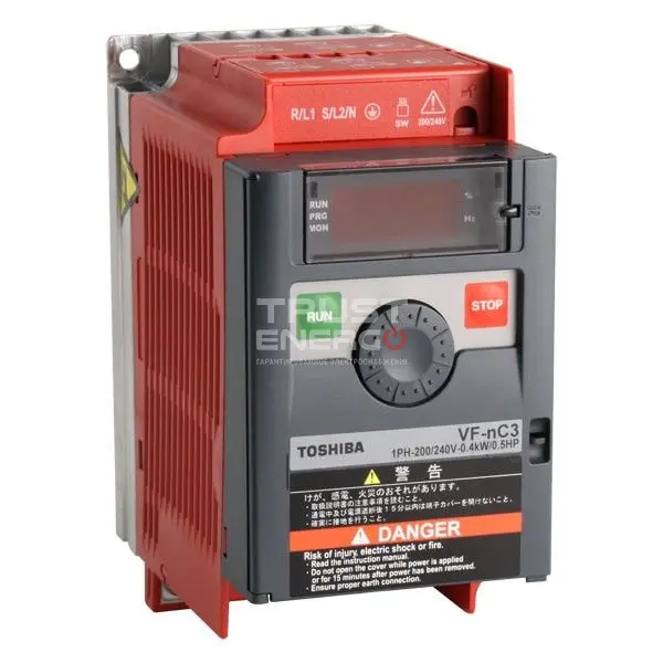 TOSHIBA VFnC3S-2007PL – компактный преобразователь частоты общего назначения с функциями повышения стартового момента, автоподхватращающегося двигателя, регенеративный режим работы при кратковременном пропадании питающего напряжения, 2 набораремен разгона и торможения.